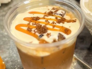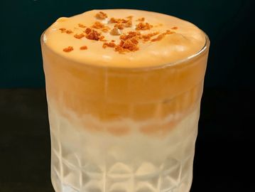 Espresso meets coconut water, topped with a fluffy whipped cream foam mixed with our signature coffee and roasted coconut chips on top.