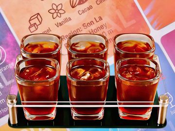 A curated tasting of six distinct cold drip coffees, each served in a shot glass. Discover the nuances of origin, roast, and brew — all in one elegant flight.