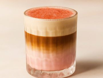 Layers of fresh strawberry puree, cold milk, rich espresso, and a dusting of real strawberry powder.