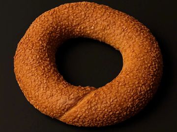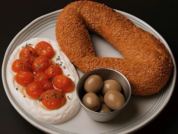 Crispy, sesame-crusted Turkish Simit, paired with our signature yogurt topped with roasted cherry tomatoes, a drizzle of olive oil, and green olives.
